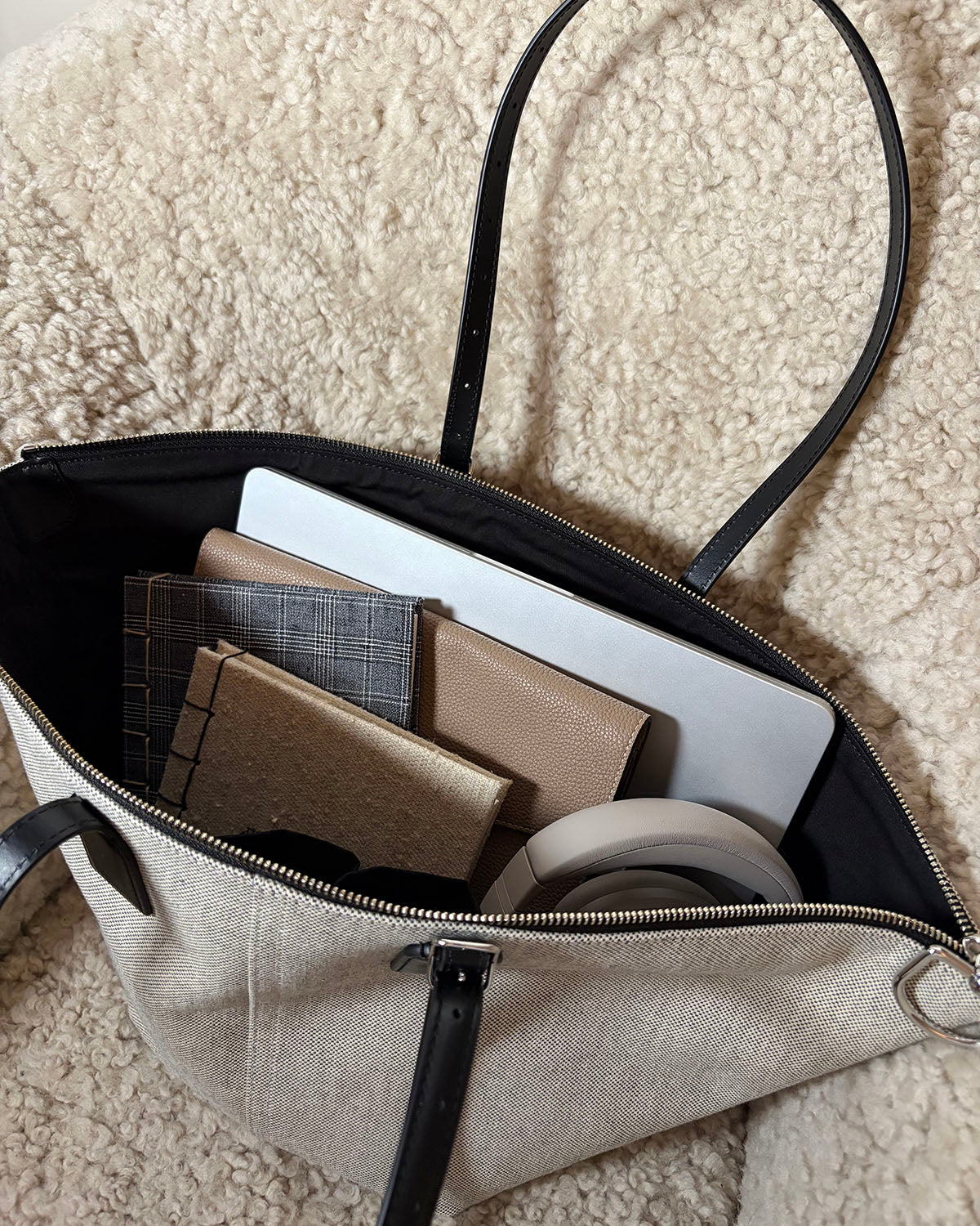 The Medium Concierge Tote in black and ecru canvas is designed as a refined everyday work bag with a sleek, minimalist silhouette. Slightly smaller than the Grand, it offers a more compact carryall that transitions seamlessly from the office to weekends and travel. A secure top zip closure, long shoulder straps, and structured shape keep essentials organized without bulk.